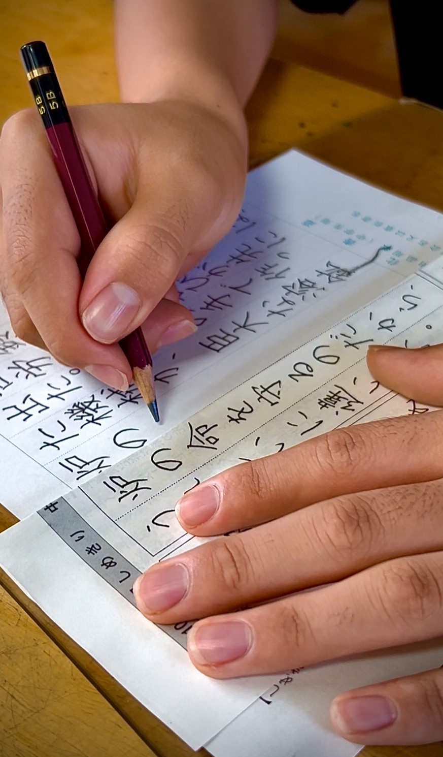 ここで学ぶ楷書体は基本的な形ですが、実際に書いてみると長年の「癖」が誰にでもあります。学校で子供達も学んでいる書写の教科書を参考に、極力癖のない、自然に意識して美文字を書けるよう導きます。