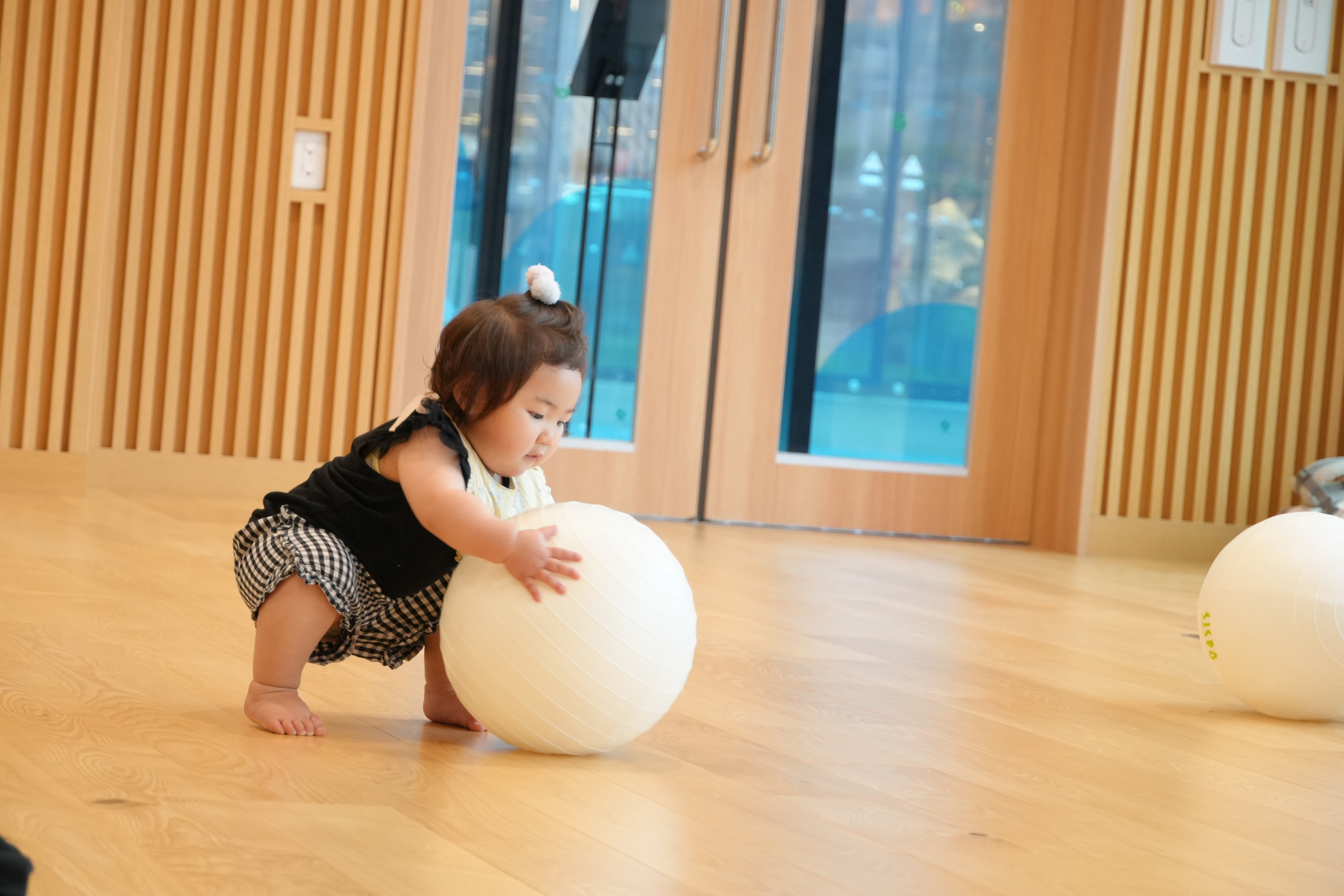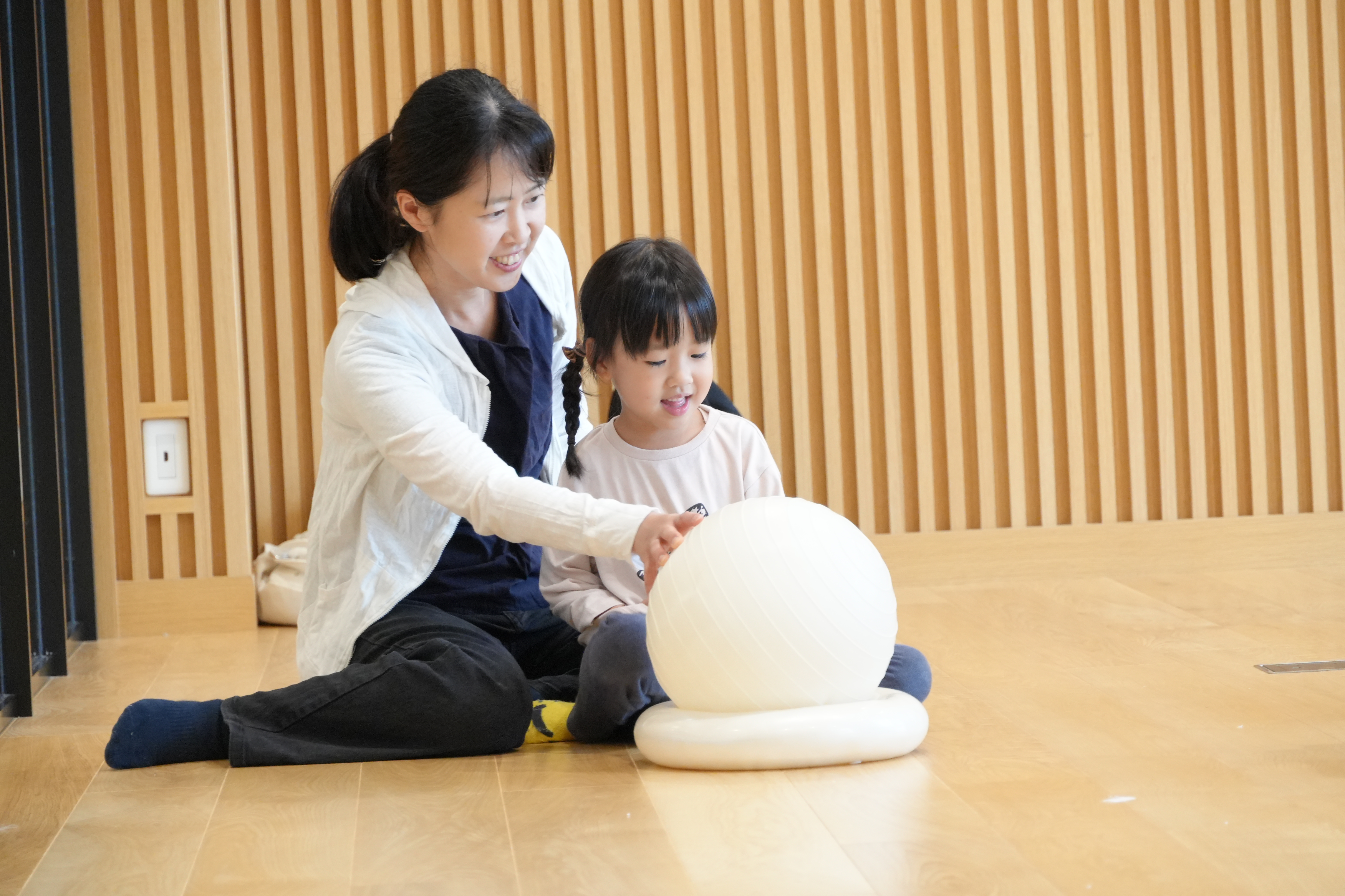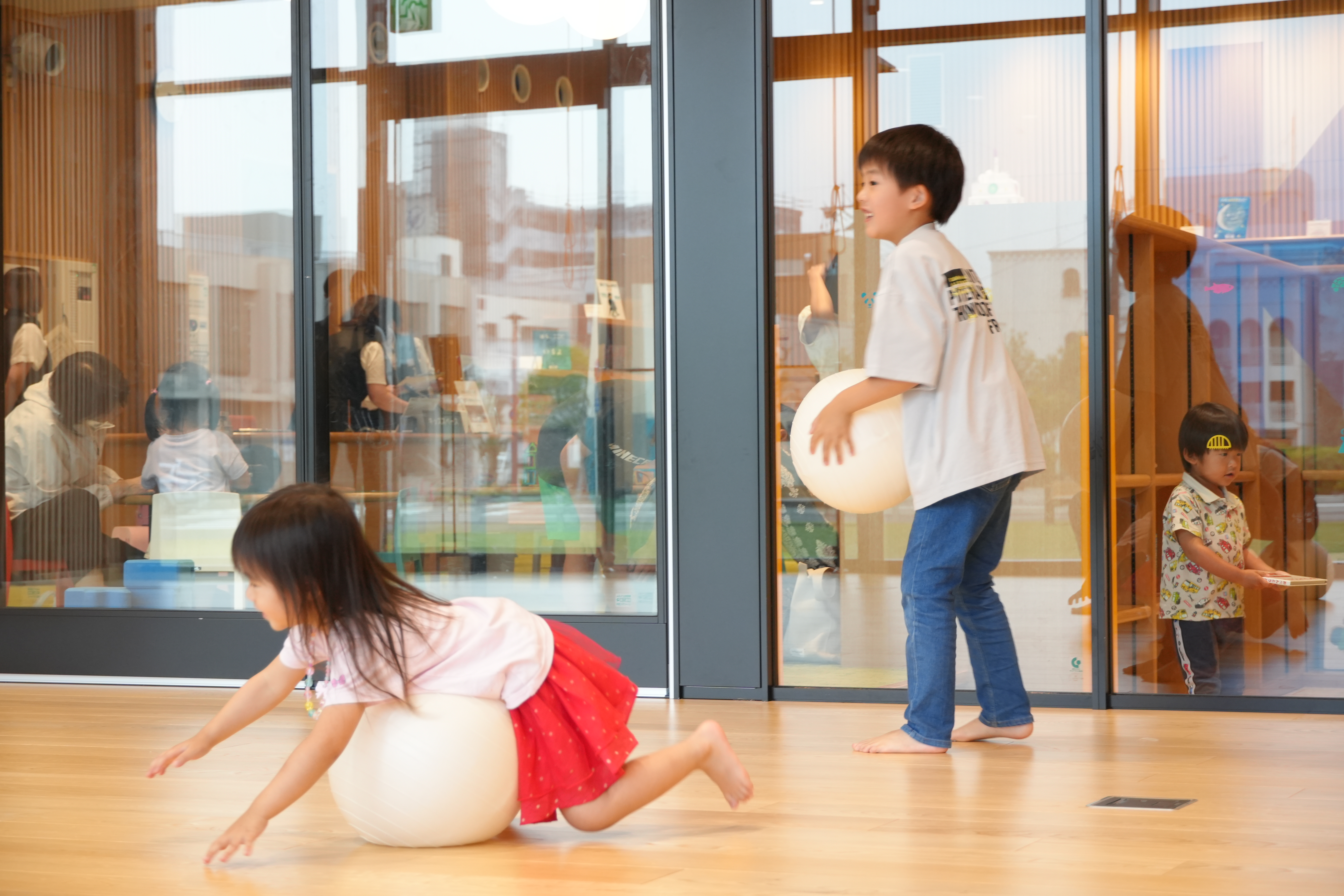 不安定なボールの上に座ったり、寝そべったり、筋肉を使って楽しくあそんでみましょう!