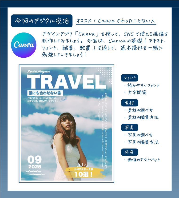 | 持ち物 | 普段使用しているiPadがある方はお持ちください(※事前に「Canva」のインストールしてください) |