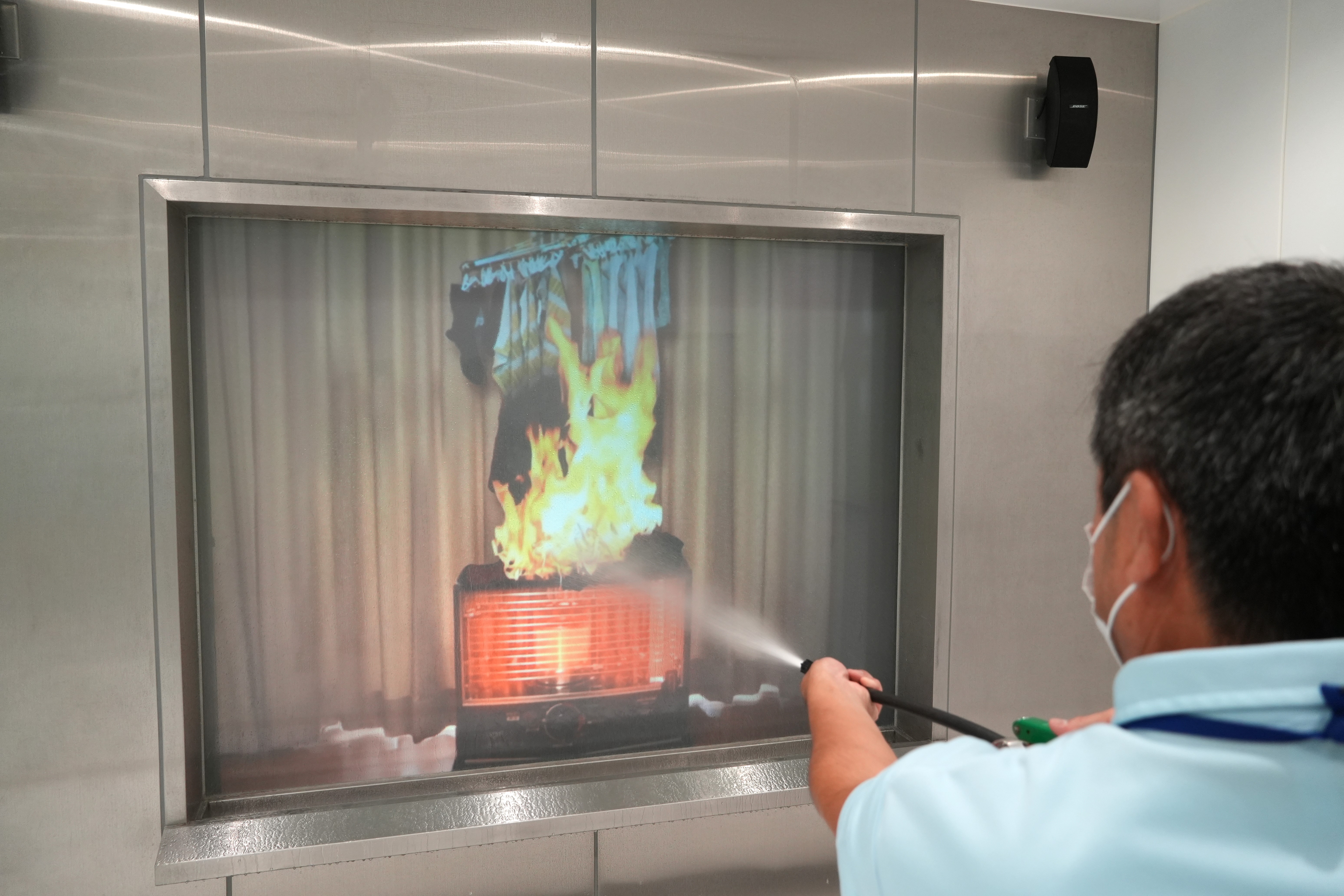地震・暴風雨・火災時の煙の体験に加えて、消火器使用の体験も。