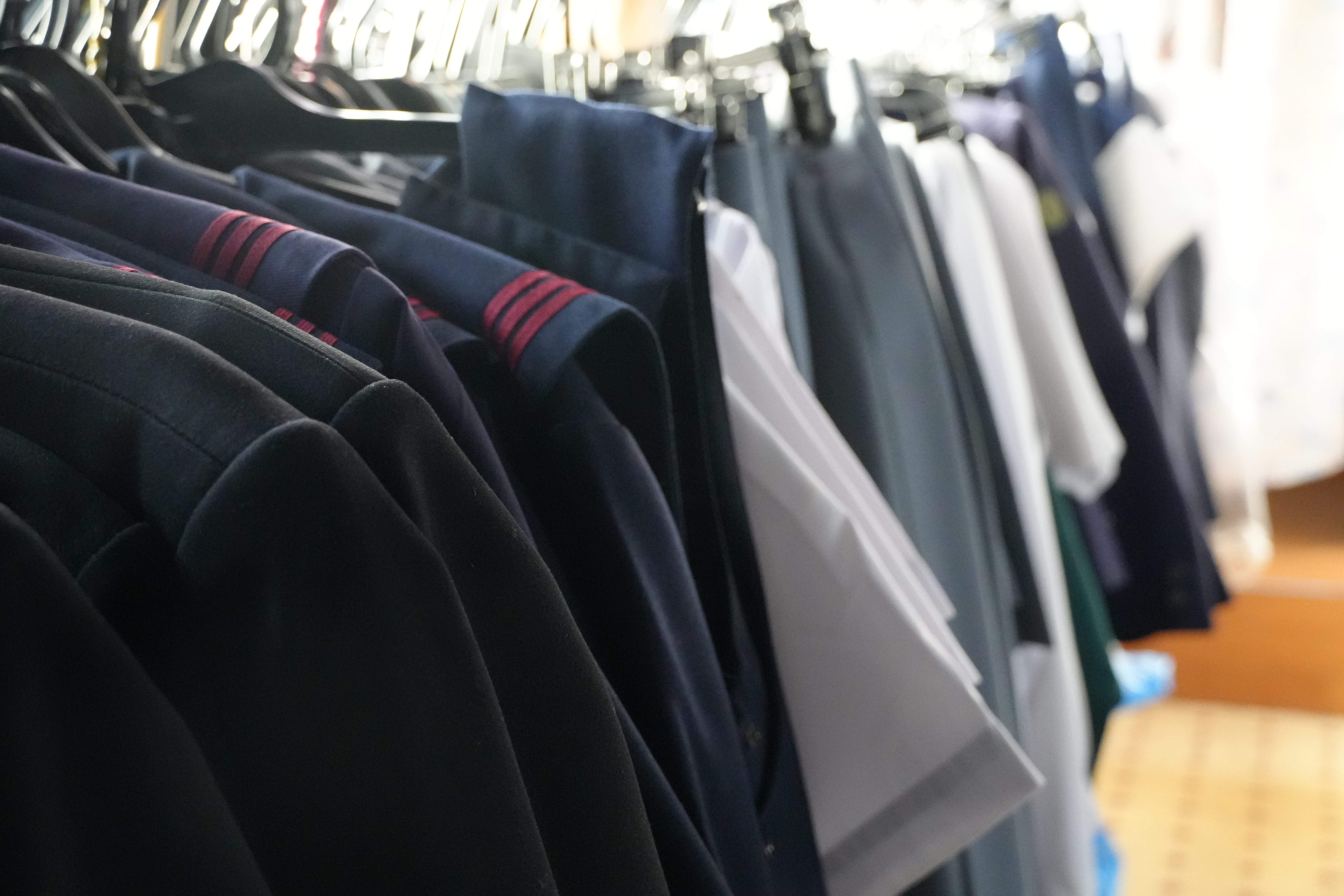 小学校の制服から高校の制服まで並ぶ店内。